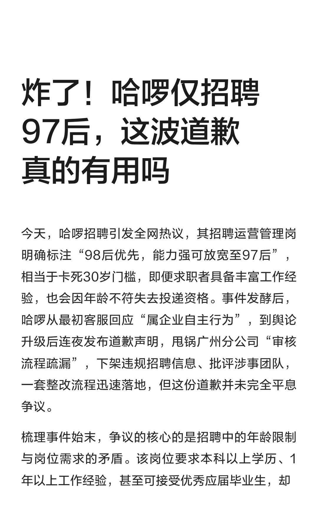 炸了!哈啰仅招聘97后,这波道歉真的有用吗
